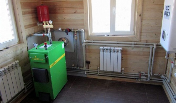- газов, електрически или твърдо гориво котел, в зависимост от наличността на гориво. Като интересна опция за даване можете да помислите за котел за пиролиза или генератор на газ. Ефективността му се постига до 92% поради факта, че след изгарянето на дърва се отделя газ, който в крайна сметка се използва и като гориво. Така от един раздел котелът работи непрекъснато в продължение на 12 часа.