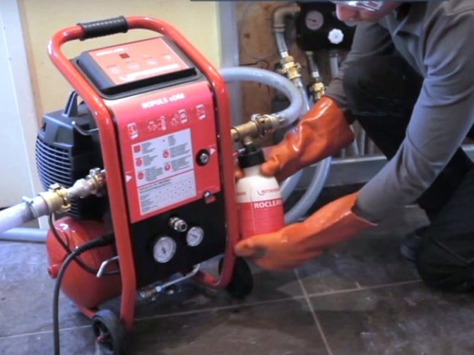Този метод за почистване на тръбопроводи на отоплителната система от шлаки се състои от следните етапи: