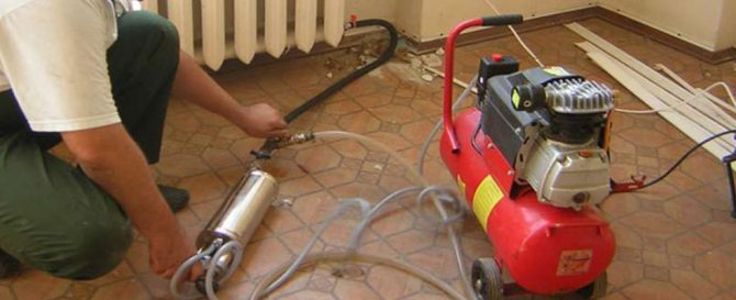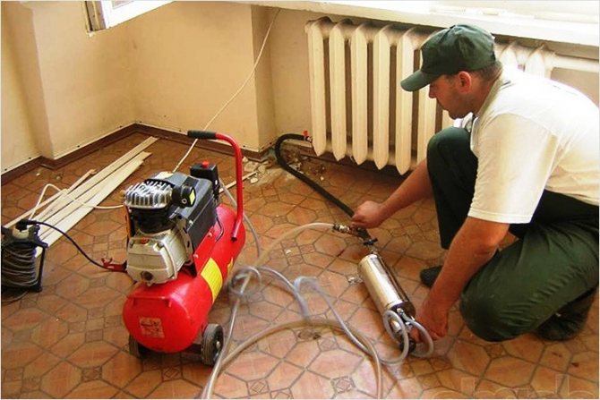 Основната същност на хидропеневматичното промиване на отоплителната система е почистване на тръбопроводната система и отоплителните радиатори с налягане на сгъстен въздух... В този случай охлаждащата течност остава в системата, тоест вода. Началото на този процес драстично увеличава скоростта на движение на течността в системата, а сгъстеният въздух придава на водата повишена турбулентност, тоест неравномерно движение и образуване на вихри. От действието на смес от въздух и вода, котлен камък и отлагания, образувани на вътрешната повърхност на системата, се разхлабват, отвеждат се от потока вода-въздух и се отстраняват от тръбите и радиаторите до точката на изпускане.