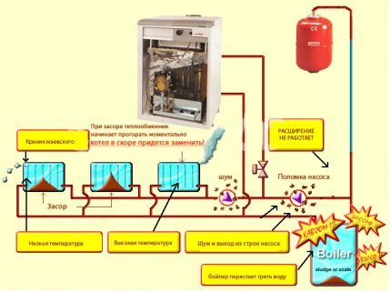 Заедно с температури до 100 ° C и високо налягане, всичко това образува „адска“ смес. Химичните реакции протичат денонощно, чийто основен резултат е образуването на котлен камък, корозия на топлообменниците и комуникациите.