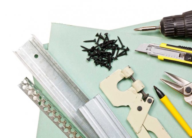 - След това трябва да изрежете и подготвите необходимия размер листове от гипсокартон. За това ще бъдат полезни предварително подготвените метални ножици. След това части от гипсокартона са прикрепени към металния профил с самонарезни винтове.