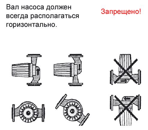 Основното правило трябва да се помни при инсталиране на циркулационни помпи: шахтата му винаги трябва да е разположена хоризонтално. Установено е, че вертикалното разположение на вала на помпата води до загуба от около 30% от производителността му.
