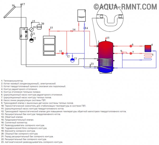 Когато жилищна сграда вече има отделна система за водоснабдяване и собствениците не планират да използват слънчеви източници на топлина за отопление на помещението, препоръчително е да спестите пари и да инсталирате кух буферен резервоар, в който цялата използваема площ на резервоарът се подава на охлаждащата течност и не се заема от намотки