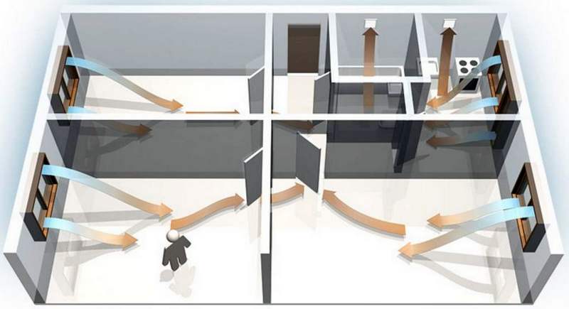 В изпускателните системи са вградени рекуператори. При тях студеният въздух, идващ от улицата, се загрява в процеса на топлообмен с отстранения въздух, който вече е топъл от апартамента. Това устройство помага да се спести енергия за отопление на помещенията.
