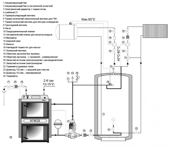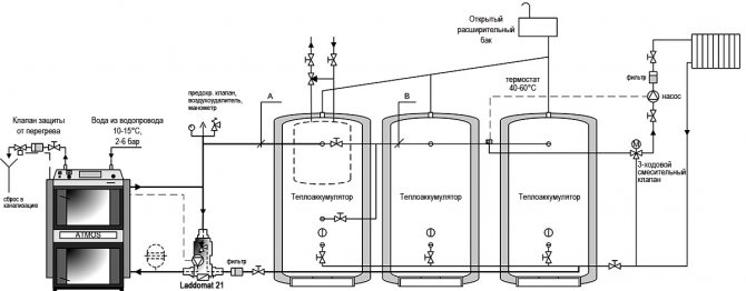 Топлоакумулаторите се предлагат в търговската мрежа като завършен продукт, въпреки че много майстори правят свои собствени. По принцип това е резервоар, покрит със слой топлоизолация. Във фабричната версия може да има вградена верига за БГВ и нагревателен елемент за нагряване на вода. Това решение ви позволява да акумулирате топлина от котел на дърва, а в моментите на неговия престой - да осигурите отопление на къщата за известно време. Схемата на свързване на котела с акумулатора на топлина е показана на фигурата: