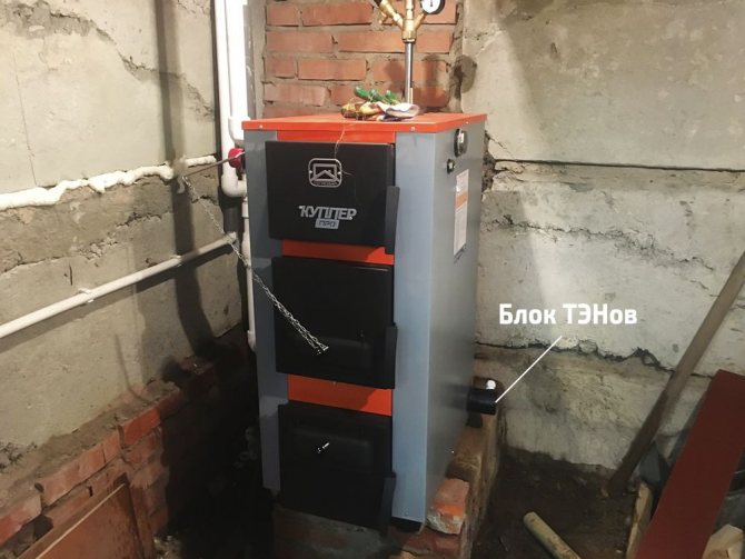 Електрическият нагревателен елемент е вграден в резервоара за съхранение на котела. Нагревателният елемент е лесен за смяна, ако изгори. За да направите това, достатъчно е да развиете дефектния нагревателен елемент и да завиете нов. Нагревателният елемент може да работи независимо или може едновременно да изгаря твърдо гориво. Този подход е полезен, когато трябва бързо да загреете системата или да удължите периодите между стартиране.