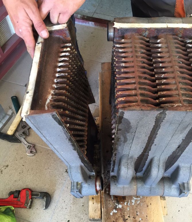 Сажди и ръжда вътре в чугунените топлообменни секции. - Почистване на горелката, горивната камера и външните стени на топлообменника... По време на работа върху тези елементи се образуват сажди, остатъци от отпадъци и прах от помещението, слой от поне 0,5 см намалява ефективността с повече от 10%. Процесът на почистване също не се различава от аналозите, с изключение на различен дизайн на горелката (ние също го описахме по-рано).