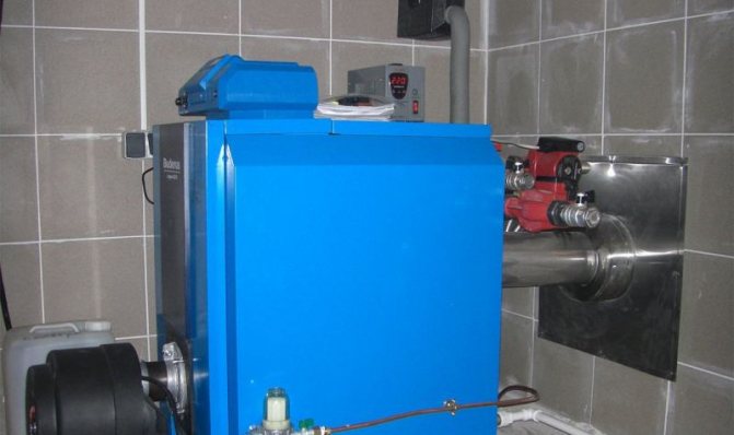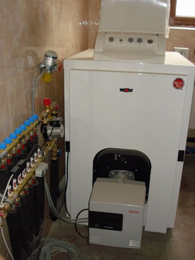 Котлите за дизелово отопление се различават от газовите котли само с горелка: той е оборудван с турбокомпресор, който осигурява необходимото налягане и пулверизира горивото през горивната камера.
