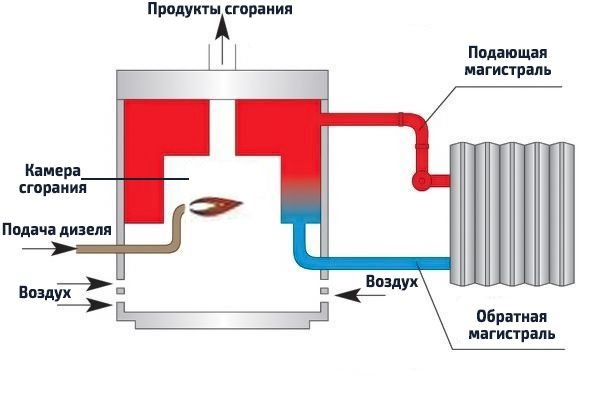 Дизеловата система работи по този начин. Горивото влиза в горелката, смесва се с въздух, пулверизира, за което се използва вентилатор. Освен това възниква запалване в горивната камера, нагряване на охлаждащата течност и стените на камерата. Коминът отстранява газовете, генерирани от изгарянето на гориво.