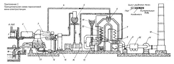 Парата, получена на изхода на инсталацията, се подава през паропровода 4 към парната турбина 3. Разширявайки се в нея, парата завърта своя ротор, свързан с ротора на електрическия генератор 2, в намотките на който е електрически ток се генерира. Токът тече към намотките на трансформатора 1.