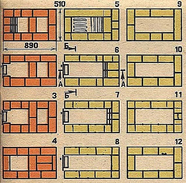 - На първия ред разтворът не се прилага. 12 парчета са разположени строго хоризонтално върху пясъка. Върху глинесто-пясъчния хоросан се поставя вентилатор. Вратата е обвита с азбестов картон, обвита с шнур. Закрепването се извършва с тел.