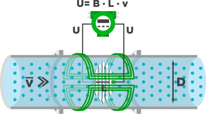 Принципът се основава на закона на Фарадей, който гласи, че напрежението, приложено към всеки проводник, докато се движи под прав ъгъл през магнитно поле, е пропорционално на скоростта на този проводник. Тоест, колкото по-бързо се движи проводникът спрямо магнитното поле, толкова по-високо ще бъде напрежението. EMF (електромоторната сила) на индукция E е пропорционална на средния дебит на течността V, вътрешния диаметър на първичния преобразувател D и магнитната индукция B. Познавайки стойността на B и D, е възможно да се изчисли стойността на дебита и дебита Q: