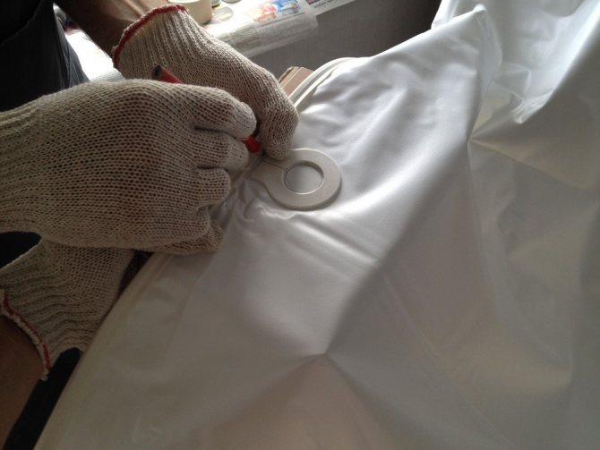 - Първо, трябва да изберете мястото, където ще бъде направен разрезът. Най-подходящата точка е на мястото, където тръбата преминава през тавана - на това място ще бъде възможно да притиснете материала добре към тръбата, така че да няма бръчки.
