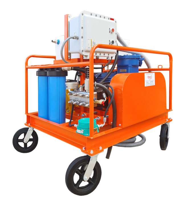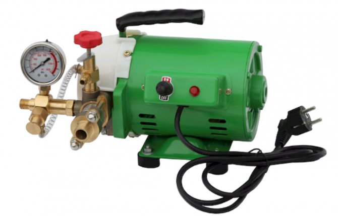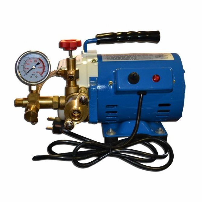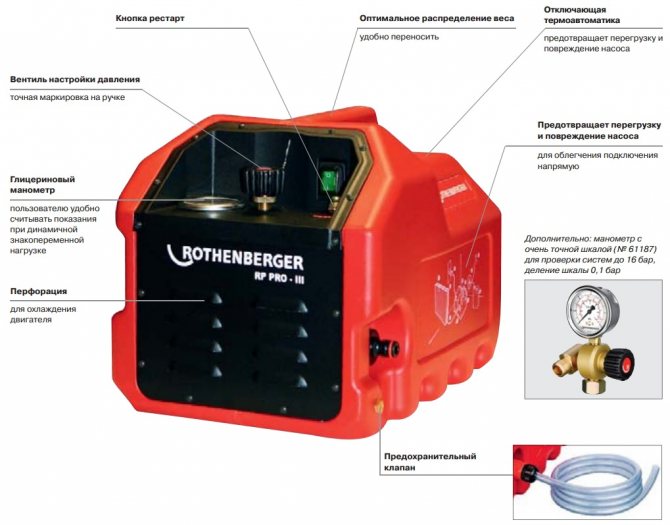 Устройството е оборудвано с мотор и работи от 220V мрежа. Това устройство се използва за тестване на отоплителни, водопроводни и маслени системи.