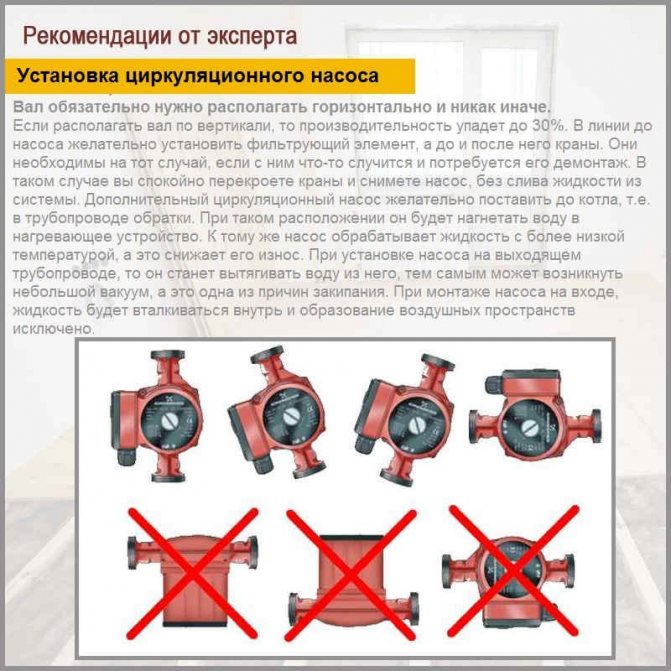 В конвенционалната система монтажниците винаги използват втората опция - оптимално е да поставите помпата точно пред котела, откъдето тя ще даде воден поток, което ще осигури равномерното й отопление. Но в случай на подово отопление е по-добре да изберете инсталация на доставката. Това се прави, за да се избегне навлизането на въздух в системата, доколкото е възможно.