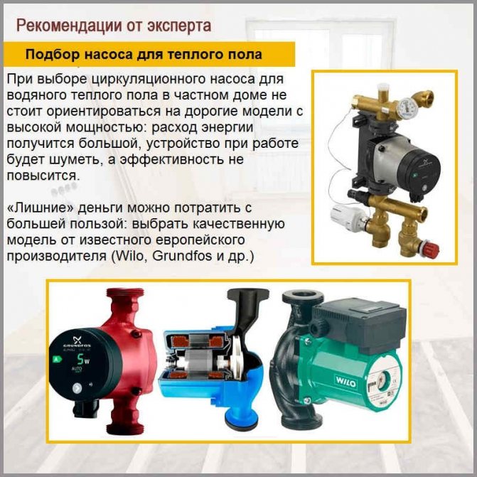 Що се отнася до фирмите. Най-добре е да вземете оборудване от европейски производители. Когато избирате помпа за воден под, по-добре е да не пестите пари: вашият комфорт и наличието на топлина в къщата зависят от това колко стабилно работи този елемент. Изберете най-добрите фирми с най-добра репутация. Германските кампании Grundfos и Wilo са се доказали добре. Но в случая с Wilo трябва да разгледате държавата, за която са произведени продуктите: тези, които отиват на пазара в ОНД и Китай, се провалят по-често. Така че внимавай.