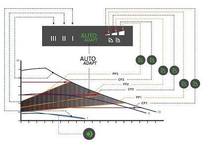 - регулиране на характеристиките на помпата в съответствие с колебанията на натоварването във времето. В AUTOADAPT помпата е настроена за пропорционално управление.