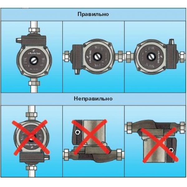 Циркулационната помпа в отоплителната система се пълни с вода и изпитва равно (ако водата не се загрява) хидростатично налягане от двете страни - от входните (смукателните) и изходните (изпускателните) дюзи, свързани към топлинните тръби. Съвременните циркулационни помпи, направени с лагери, смазани с вода, могат да се поставят както на захранващия, така и на връщащия тръбопровод, но най-често те се поставят на връщащата линия. Първоначално това се дължи на чисто техническа причина: когато се поставят в по-студена вода, експлоатационният живот на роторните лагери и салниковата кутия, през която преминава валът на помпата, се увеличава. И сега те са поставени на връщащата линия по-скоро по навик, тъй като от гледна точка на създаването на изкуствена циркулация на вода в затворен контур, местоположението на циркулационната помпа е безразлично.