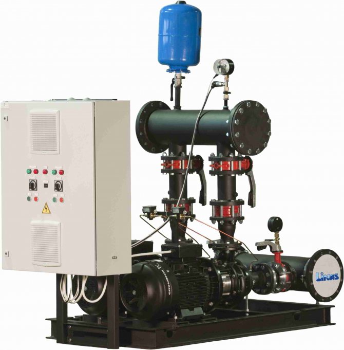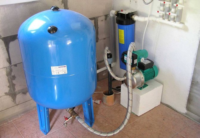 - Монтаж на помпена станция с високо налягане, оборудвана с хидроакумулатор с голям капацитет. Основният елемент на устройството е центробежна помпа, която може самостоятелно да повишава водата до необходимата височина, което ви позволява да получите добро налягане на изхода. няма налягане във водоснабдителната система.