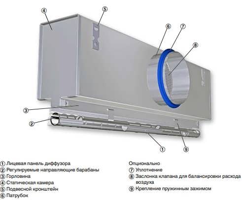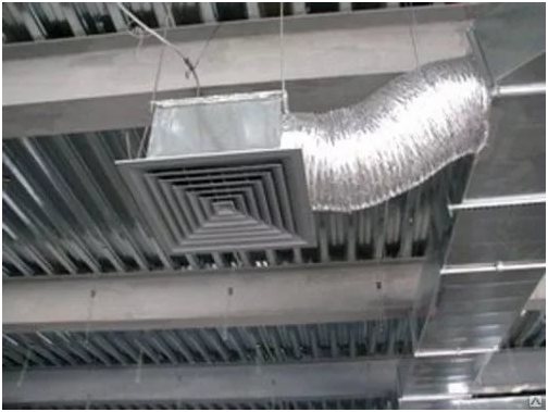 Има два начина за свързване на дифузорите към вентилационните канали: директно или чрез адаптер (пленумна кутия). По-правилен е вторият вариант, но той изисква по-голяма разлика между основата и декоративния таван.