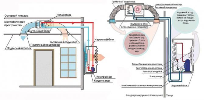 Вътрешният блок съдържа тръба с фреон - вряща течност. Изпарението на фреона води до охлаждане на съдовете, които в този случай са тръбите на топлообменника. Въздушните маси преминават през вентилатора и непрекъснато се охлаждат.