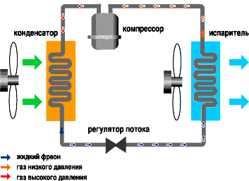 Принципът на работа на всички охлаждащи устройства се основава на фреон. Фреонът е смес от етан и метан. Фреонът може да бъде в течна и газообразна форма.