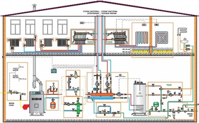 Важен момент е фактът, че в частните къщи отоплителните системи се състоят от горно и долно окабеляване, използващи вертикални и хоризонтални елементи. В едноетажна къща е най-добре да се използва горното окабеляване с наличието на главен тръбопровод в тавана, а за отопление на двуетажна къща, долната обикновено се използва с котел в мазето. Видео преглед на котелното на частна къща с комбинирано отопление.