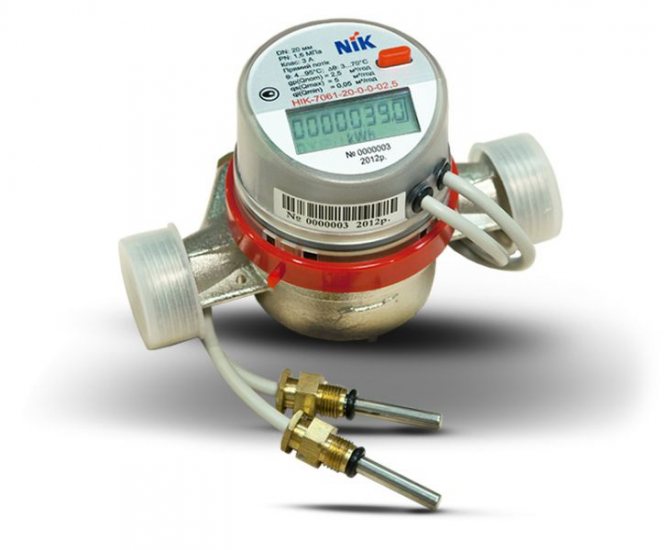 | Механични | Най-простият от видовете строителство, следователно, цената му е доста ниска и е на нивото от 9-10 хиляди рубли. Това е устройство с жични температурни сензори, водомер и електронен блок. Работният елемент е част, която се върти, когато охлаждащата течност преминава през устройството, и това е броят на оборотите, който задава обема, който е преминал през устройството. На захранващите и връщащите тръби се поставят два термометра и това може да се направи както вертикално, така и хоризонтално |