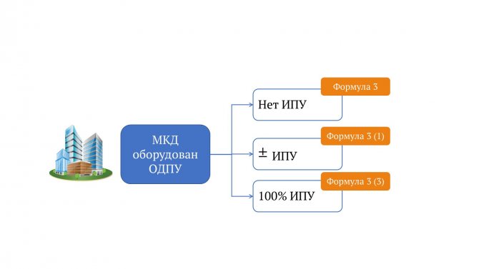 2.Ако къщата е оборудвана с контролна зала и всички 100% от помещенията са оборудвани с IPU, тогава формули 3.3 (обем на консумация на месец) и 3.4 (размер на корекцията) от допълнение 2 към Правило 354 (колона 3 на ред 4 от таблицата).