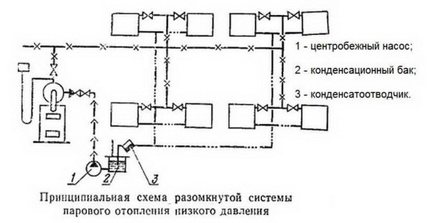 За отворени системи в края на линията е монтиран резервоар за събиране на кондензат и е инсталирана помпа. Разклонителната тръба, която преминава от нея към отоплителното устройство, трябва да има по-малък диаметър от останалите тръби.