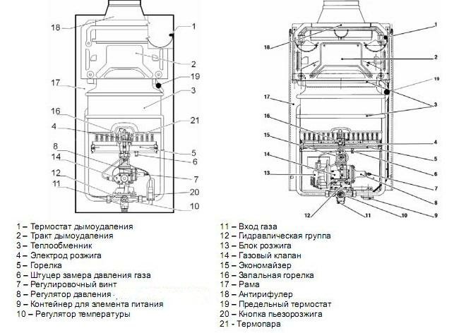 Газовият клапан се отваря автоматично веднага след включване на водата или активиране на процеса на нагряване на охлаждащата течност. Основната горелка е снабдена с газ, който се запалва от пилота и генерира топлина. Водата постъпва в топлообменника, който представлява спирална тръба, където е подготвена за подаване към отоплителния кръг или към захранването с топла вода.