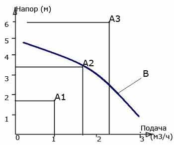 След приключване на изчисленията и определяне на основните параметри (дебит и налягане), ще пристъпим към избора на подходяща циркулационна помпа. За целта използваме графики на техническите им характеристики (B), които могат да бъдат намерени в паспорта или в инструкциите за експлоатация. Такава графика трябва да има две оси със стойностите на напора (обикновено в m) и дебита (капацитета) в m3 / h, l / h или l / s. На тази графика нанасяме данните, получени по време на изчислението, в съответното измерение и в тяхното пресичане намираме точката (A). Ако е над характеристичната крива на помпата (A3), тогава този модел не ни подхожда. Ако точката пада върху диаграмата (А2) или е под нея (А1), тогава това е подходящ вариант. Но трябва да се има предвид, че ако точката е значително по-ниска от графиката (А1), това означава, че помпата ще има прекомерен резерв на мощност, което също е непрактично, тъй като ще консумира повече електроенергия и цената й също ще бъде да бъде по-висока от модела, характеристичната графика, която ще бъде възможно най-близо до нашата точка.