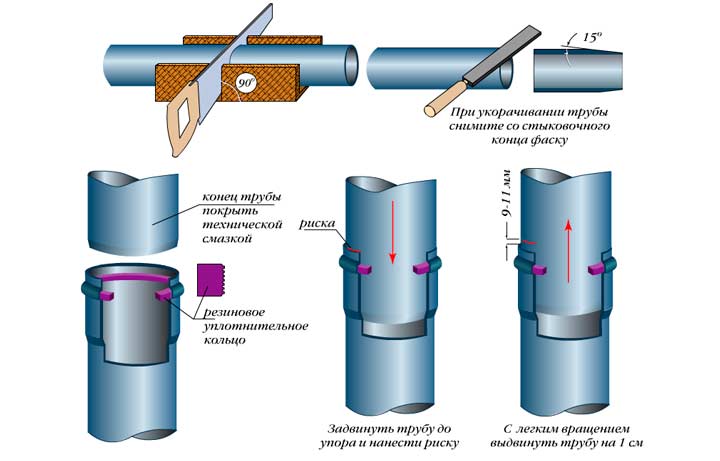 Важно: този метод за свързване на тръби се използва при инсталиране както на външни, така и на вътрешни канализационни мрежи.