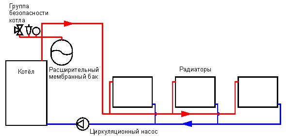 Според експерти най-ефективна е била вертикалната верига с принудителен воден поток. Нуждае се от помпа, която се намира на връщащата линия пред котела. На него също е монтиран разширителен резервоар. Благодарение на помпата, тръбите могат да бъдат по-малки, отколкото при дизайн с естествено движение: с негова помощ ще бъде гарантирано движението на водата по цялата линия.