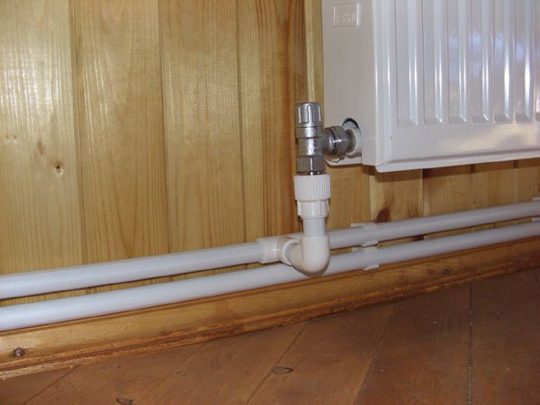 Ако тръбопроводът е до входната врата, е подходящо да се раздели на два колена. След това маршрутът се създава от горната точка на системата. Долната линия на двутръбната конструкция трябва да бъде симетрична и успоредна на горната.