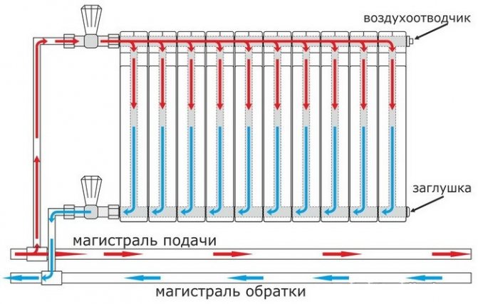 Разглежданата схема на свързване с две тръби, когато се използва, разкрива много предимства. Първо, равномерността на разпределението на топлината по цялата линия и индивидуалното подаване на охлаждащата течност към радиаторите.