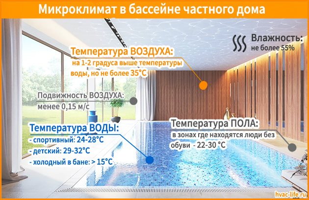 В зависимост от предназначението на басейна и неговите характеристики на площта се избират стандартизирани температурни параметри, които трябва да се осигурят от избраното вентилационно оборудване. В този случай е необходимо да се вземе предвид наличието на отоплителни системи, допълнително отделяне на топлина и топлинни загуби.