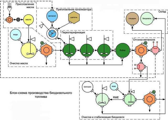 Растителното масло или се изцежда на място, или се предлага в завършен вид, или се използват мастни отпадъци от производството на храни. След процеса на пречистване той постъпва в трансестерификационните реактори. Приготвената смес от катализатор и реагент, метанол, навлиза там през собствения си канал. Освен това има технологични цикли на разделяне на фракциите и тяхното многоетапно пречистване.В резултат на това биодизелът и рафинираният глицерин се доставят в склада като краен продукт, а възстановеният излишък от метанол се връща за повторна употреба.