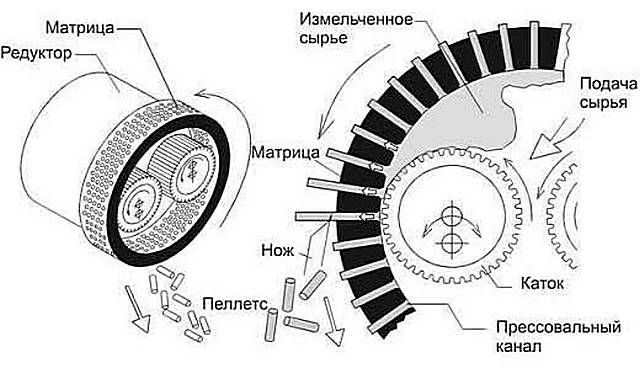 Основните части на гранулатора са матрицата и смачкващите ролки
