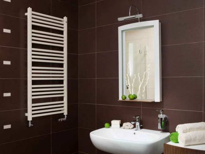 Забележка! Отопляемата релса за кърпи е извита метална тръба, която е прикрепена към стената на банята. Металът е добър проводник, така че пренася топлината добре в околното пространство. Благодарение на това става по-топло и по-удобно в банята.