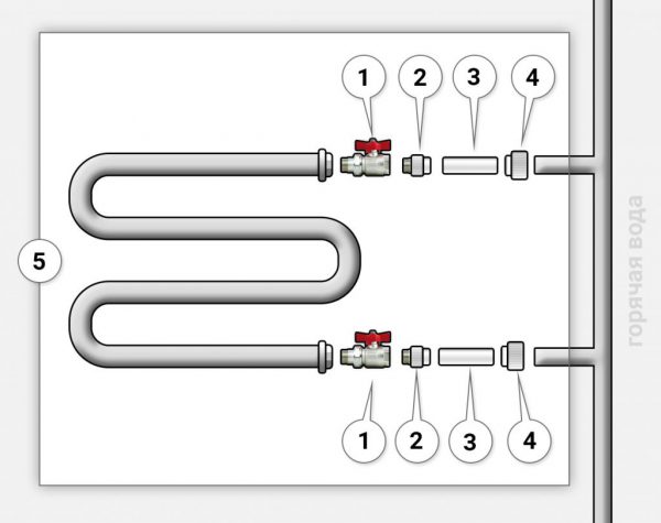 Схемата за свързване на нагревател за кърпи към захранване с топла вода (захранване с топла вода) е доста проста, така че можете да се справите с тази задача, без да включвате майстор на трета страна. По време на монтажа намотката се вгражда в общата система за отопление или водоснабдяване и става неразделна част от нея, поради което към нейното инсталиране трябва да се подхожда много отговорно. Тази операция се извършва в следния ред: