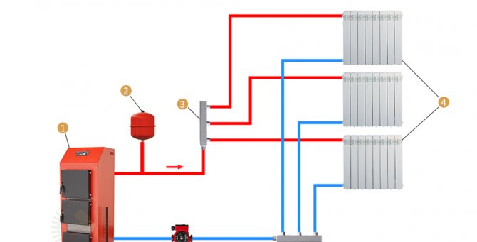 Контур за радиационно отопление: 1 - котел; 2 - разширителен резервоар; 3 - захранващ колектор; 4 - отоплителни радиатори; 5 - връщащ колектор; 6 - циркулационна помпа