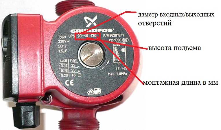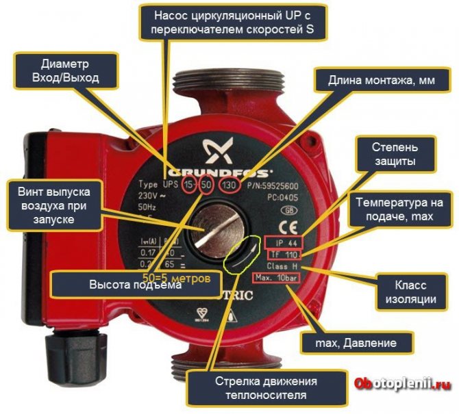 Обозначение на помпата Grundfos UPS 25-40 или Compass 25-40 означава, че номиналният диаметър на неговите разклонителни тръби е 25 mm, което означава, че свързващата резба е 1 инч, тази помпа е способна да развива глава до 4 метра (40 дециметра).