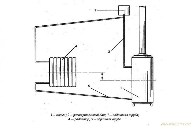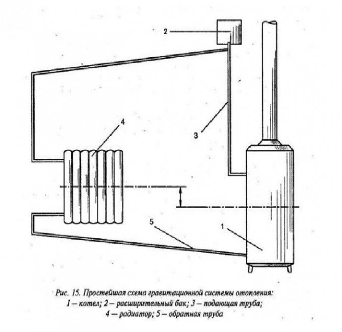 Автономна система от отворен тип. В тази система всичко е подредено доста просто. Разширителният резервоар е течаща конструкция, затворена с капак, за да се предотврати навлизането на прах и др. Движението на охлаждащата течност през отворена отоплителна система е възможно поради конвекция. В този случай източникът на топлина влиза в контакт с въздуха директно в разширителния резервоар, който от своя страна изпълнява 2 функции: компенсира разширяването на охлаждащата течност и в същото време е най-високата точка на веригата, в която се отвежда вентилираният въздухът влиза.