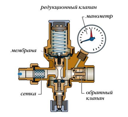 Дизайнът на този вид фитинги е прост и непретенциозен. Устройството се състои от месингово тяло, в което се помещава пружинно затваряща диафрагма, свързана към стеблото. Устойчивостта на пружината е основният фактор, който поддържа мембраната в заключено положение. Регулиращата дръжка регулира силата на компресия на пружината.