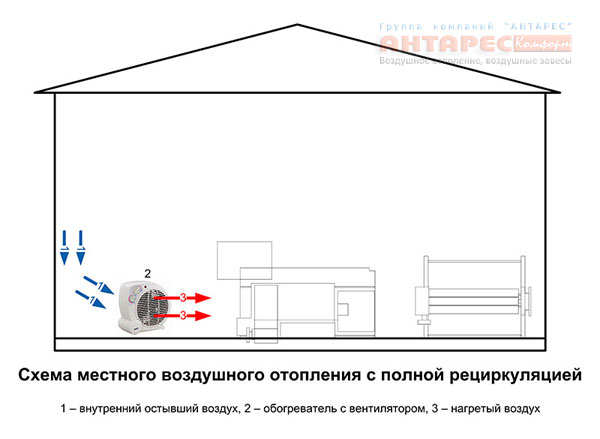 Локална въздушна отоплителна система с частична рециркулация При частична рециркулация част от въздуха за отопление навлиза в нагревателя отвън - т.е. локалната въздушна отоплителна система изпълнява едновременно функциите на вентилационната система на помещението. В същото време въздухът в стаята ще бъде не само топъл, но и свеж.