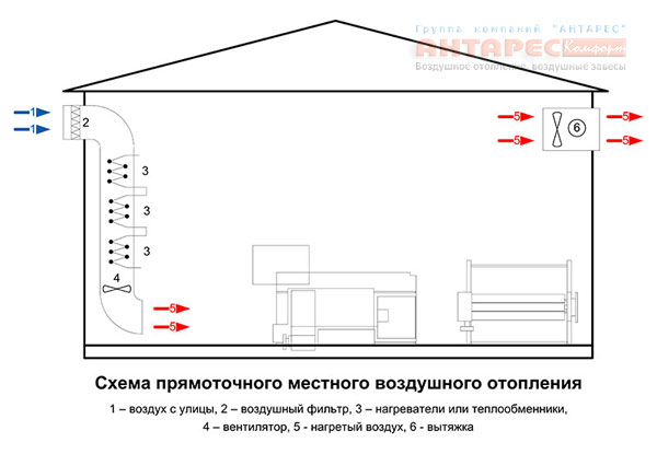 Локална въздушна отоплителна система с директен поток В тази система целият въздух се подава към нагревателя от улицата, загрява се и с помощта на вентилатор влиза в стаята или помещенията и след това се изхвърля обратно на улицата. Много скъпа опция на системата, тъй като е необходим много мощен нагревател за постоянно затопляне на големи количества въздух, който обикновено не се използва в частни селски къщи. Но за обществени или промишлени помещения със строги изисквания за вентилация (например, ако производствената зона отделя пари от вредни вещества и трябва постоянно да ги отстранявате), това може да е единственият начин да се направи отопление на въздуха.