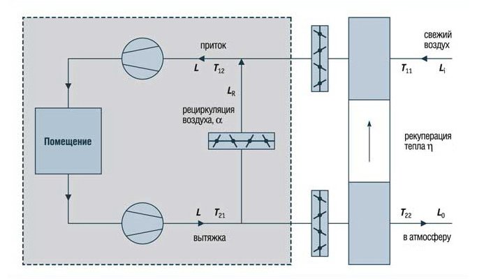 Приточна и изпускателна вентилация с рекуперация и рециркулация, където L е въздушният поток, T е температурата.