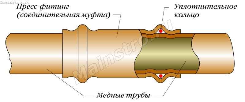 Този метод на свързване не изисква нагряване на части и се счита за един от най-бързите. Ако количеството работа е малко, тогава можете да закупите ръчна преса за медни тръби, за която освен малко физическо усилие не се изисква нищо. Той осигурява необходимата плътност чрез притискане на свързващия фитинг към уплътнителния пръстен.