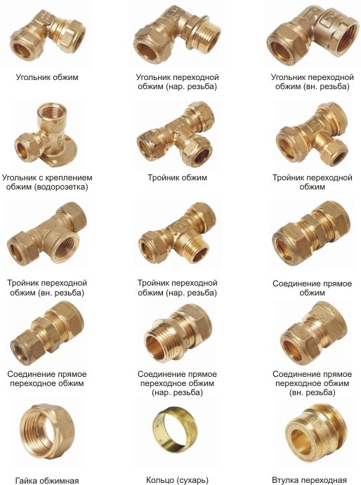 Има много разновидности на свързващи и преходни фитинги. Някои примери са показани на снимки 1-12. Така че, за запояване се използват не само обикновени и преходни съединители, но и различни колена, тройници, кръстове, контури, ролки и тапи. Има фитинги с преход на запоена връзка към резбована, например "американски" с конусно уплътнение (15 × 1/2 "). Пресовите фитинги с резба често използват накрайник, който при затягане на съединителната гайка компресира тръбата, като по този начин уплътнява връзката.